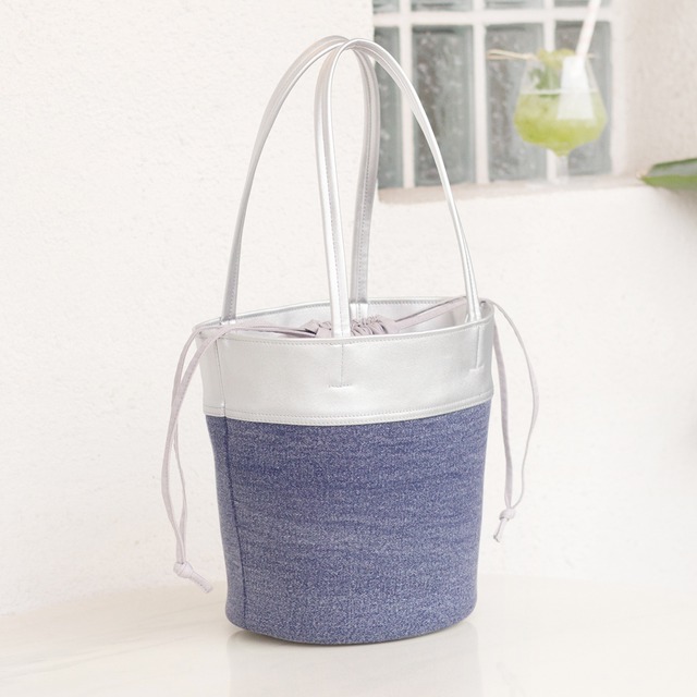 バケツ型トートバッグ【シルバーPUレザーxブルーウォッシュドデニム】巾着開閉