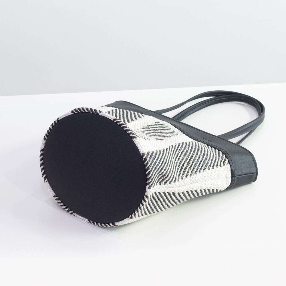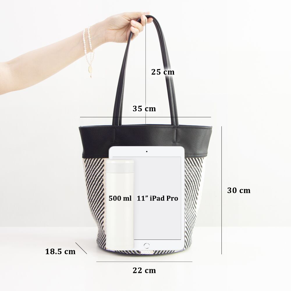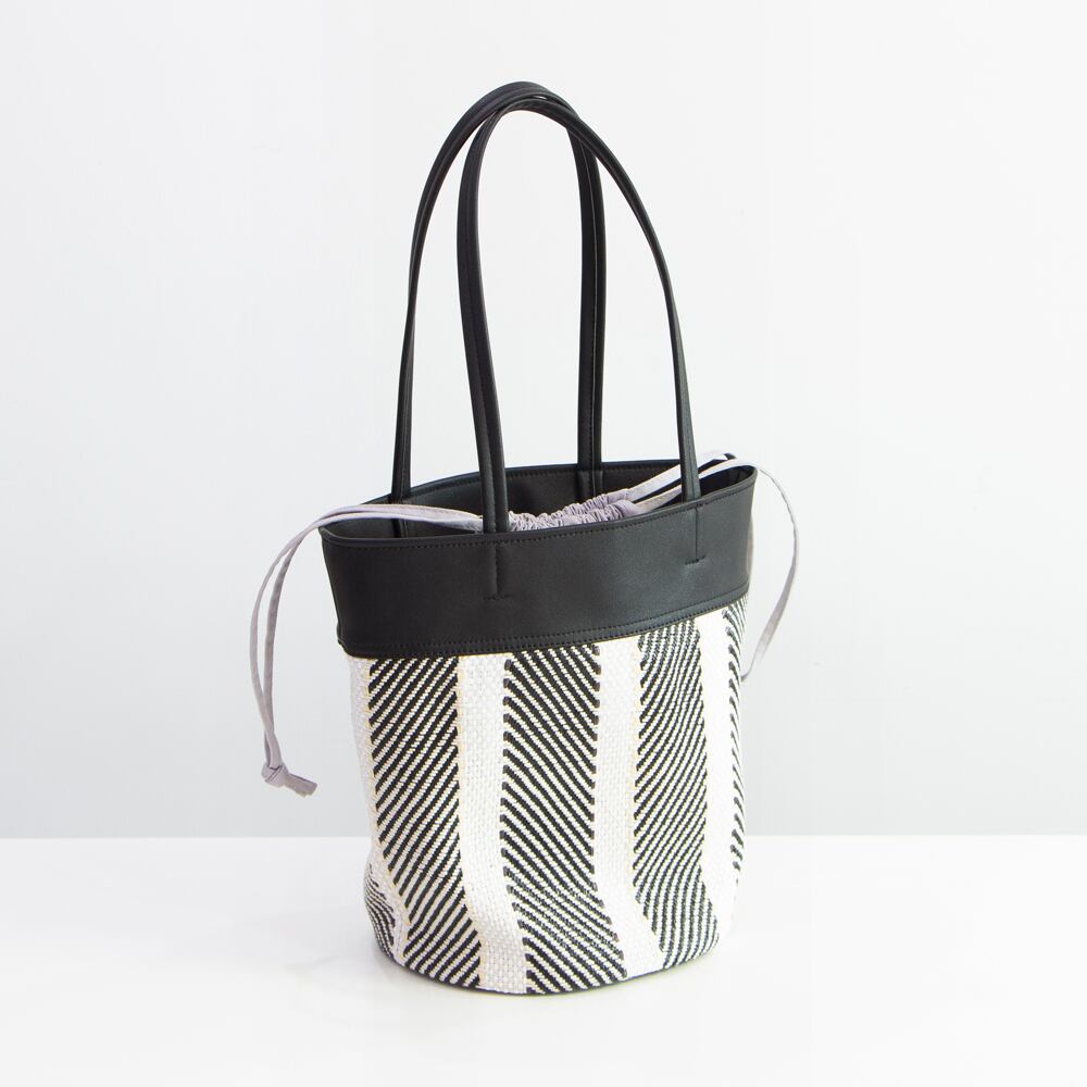 夏の気分にぴったりな、柔らかく軽いコットンポリエステル混合の編み素材を使用し、滑らかな肌触りと高級感のあるPUレザーで仕上げたバケツ型トートバッグです。