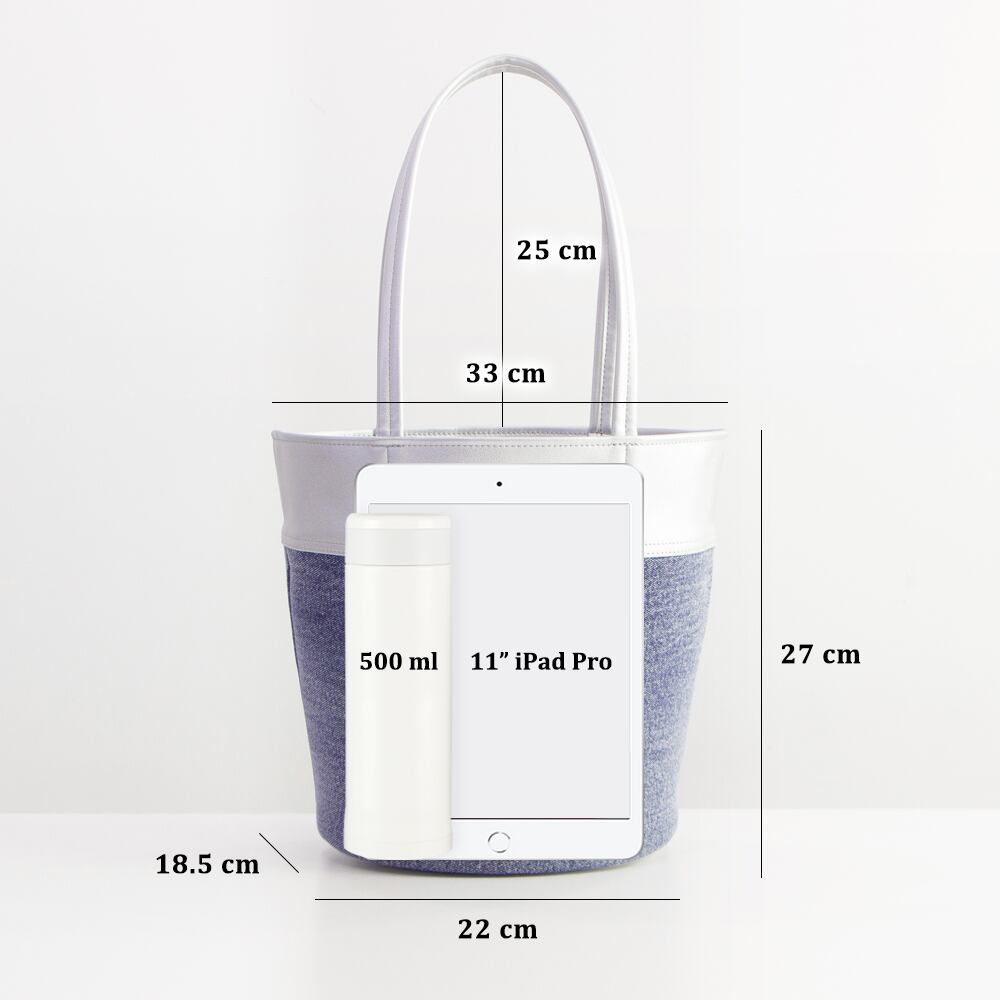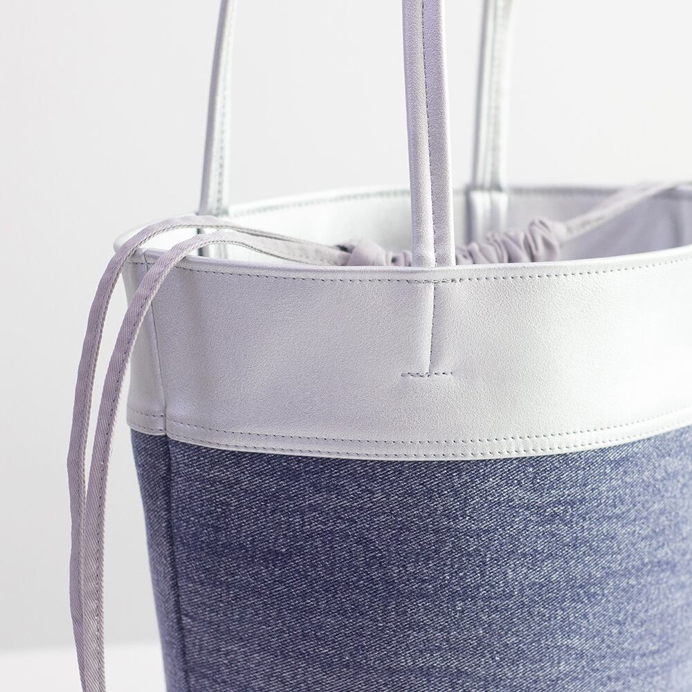 滑らかな肌触りと高級感のあるPUレザーを使用しています。洗い加工をして風合いが出るウォッシュドデニムと組み合わせることで、シンプルでありがなら、個性的な特徴を持ち、機能性も兼ね備えたカジュアルなバケツ型トートバッグが完成しました。