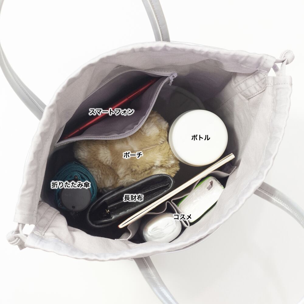 口は巾着仕様になっており、広く開けて物を出し入れしやすくなっています。