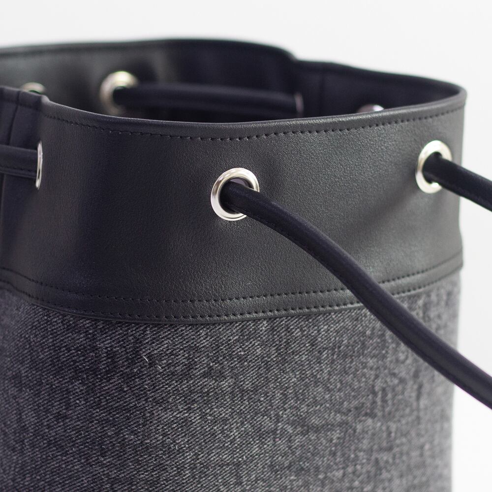 本革のような質感にこだわり特注した合成皮革を使用しています。洗い加工をして風合いが出るウォッシュドデニムと組み合わせることで、シンプルでありがなら、個性的な特徴を持ち、機能性も兼ね備えたカジュアルな巾着バッグが完成しました。