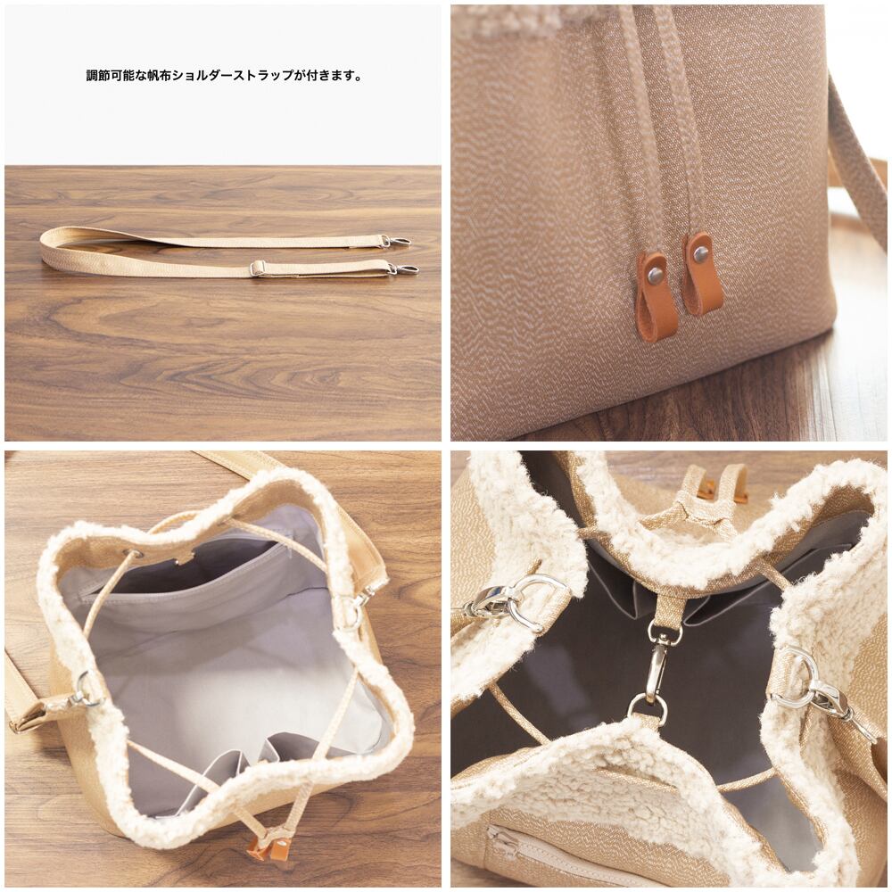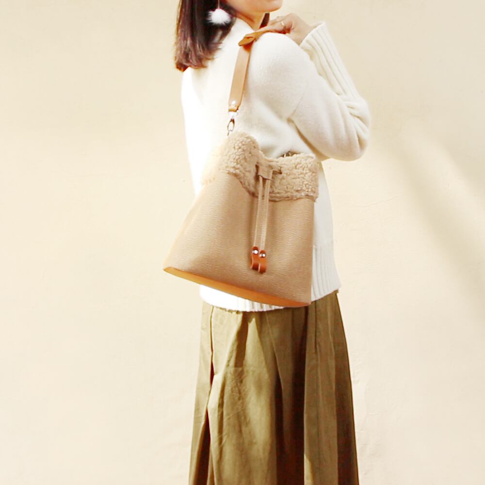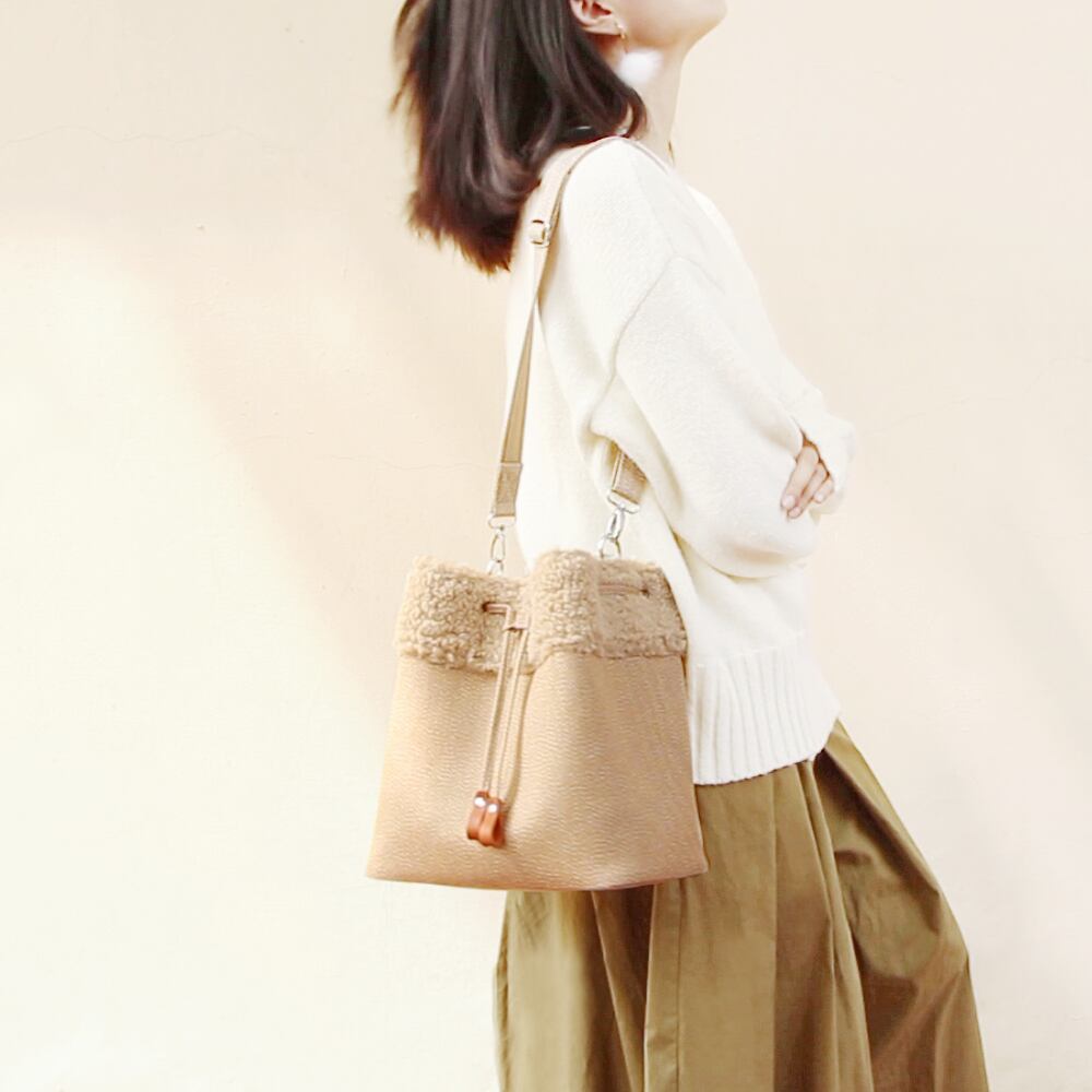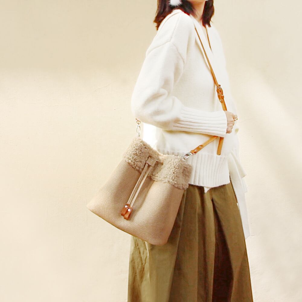 トレンドのボア素材、2色の糸で織られる特別な帆布と組み合わせて、ちょうどいいもこもこ感が大人かわいいな特徴を持ち、機能性も兼ね備えたスタイリッシュなバケットバッグが完成しました。