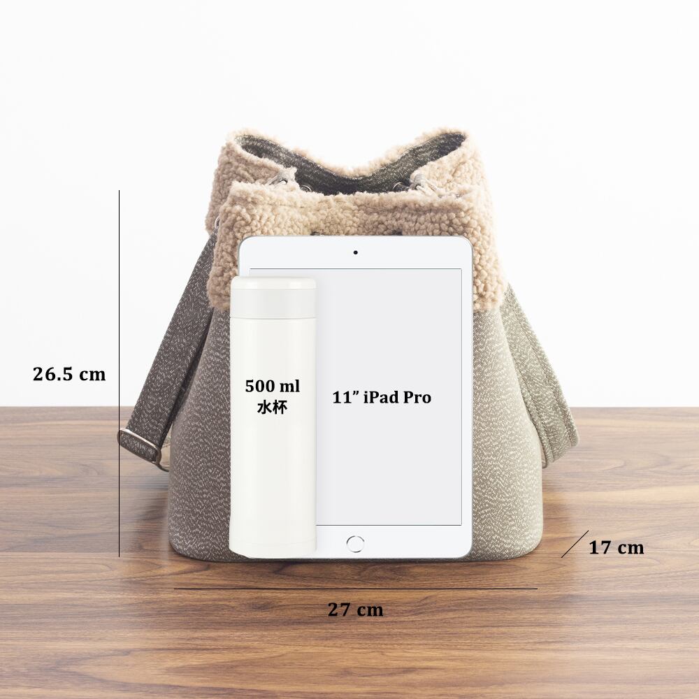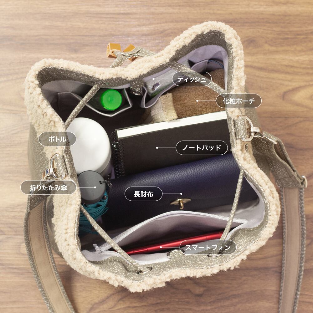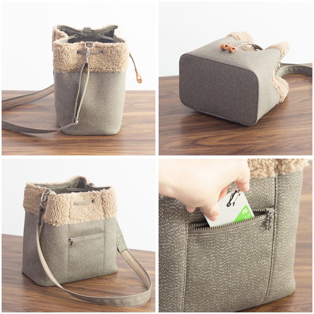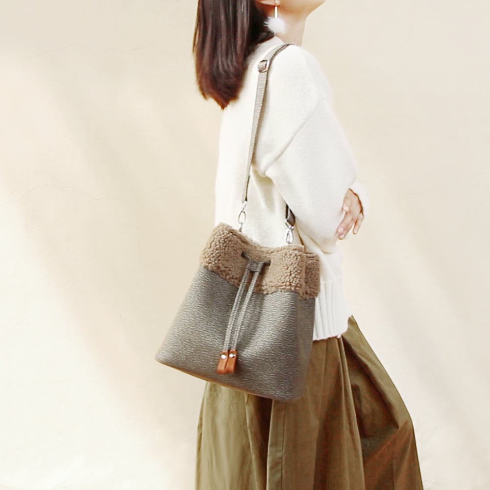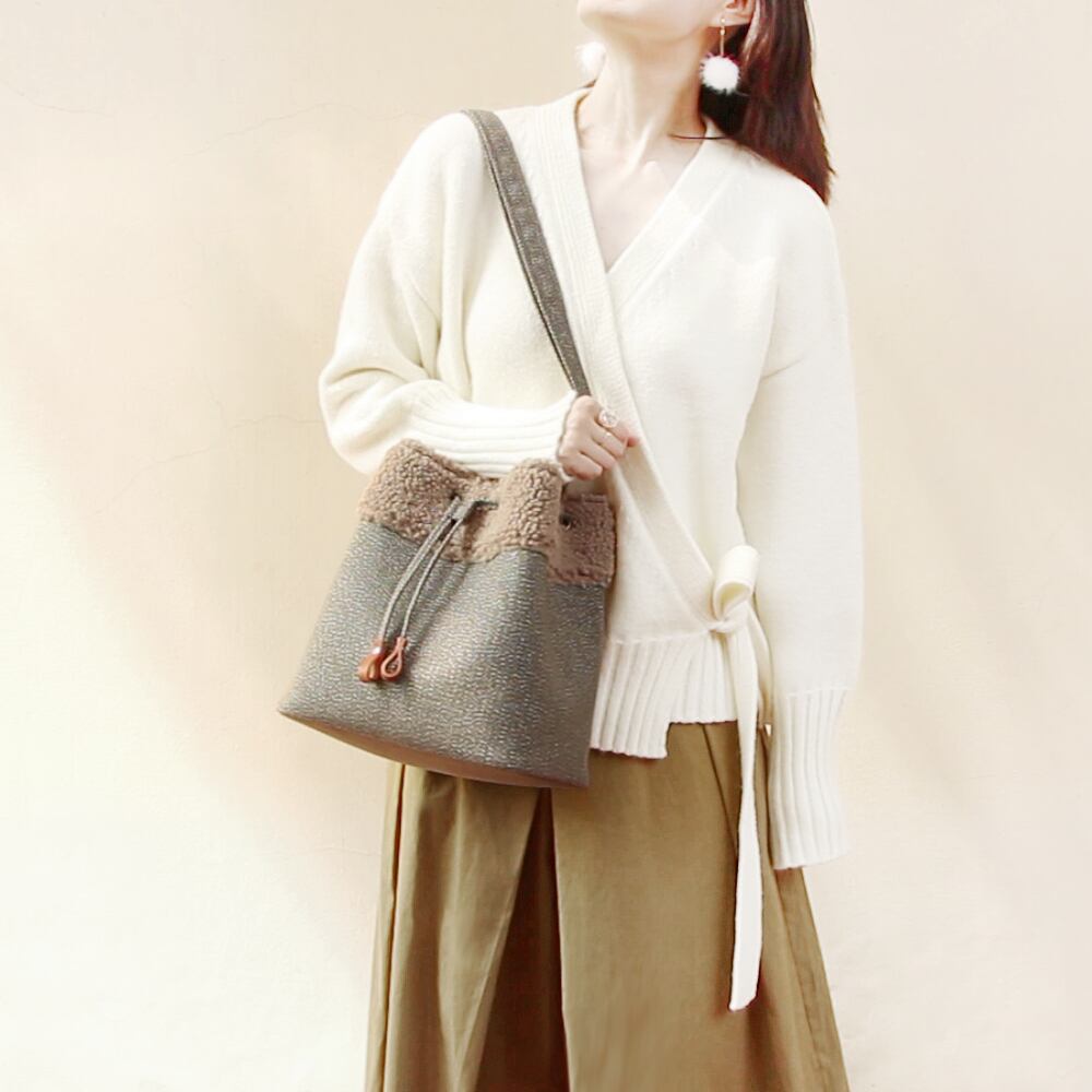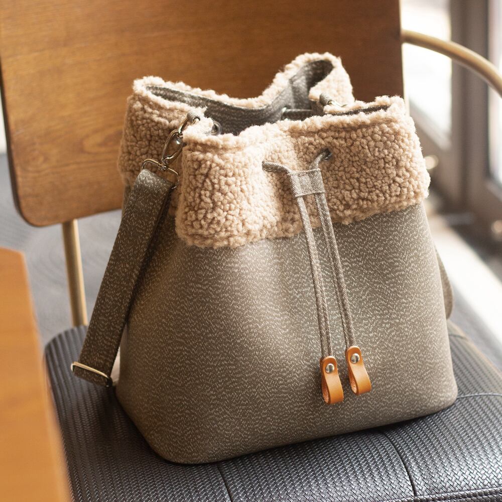 トレンドのボア素材、2色の糸で織られる特別な帆布と組み合わせて、ちょうどいいもこもこ感が大人かわいいな特徴を持ち、機能性も兼ね備えたスタイリッシュなバケットバッグが完成しました。