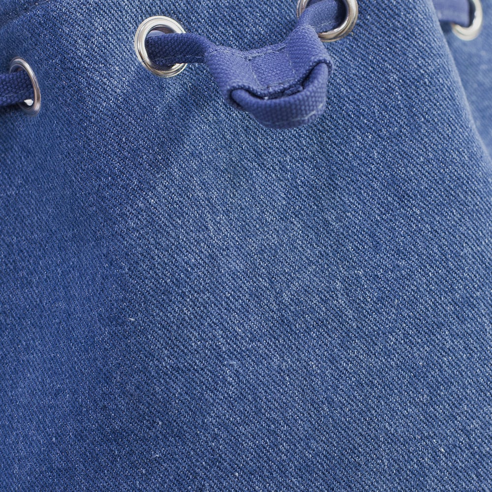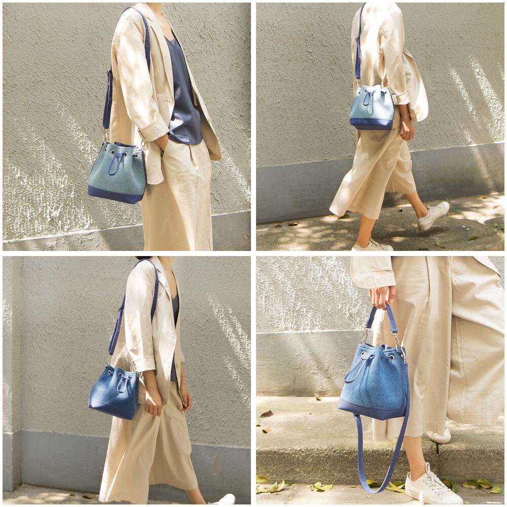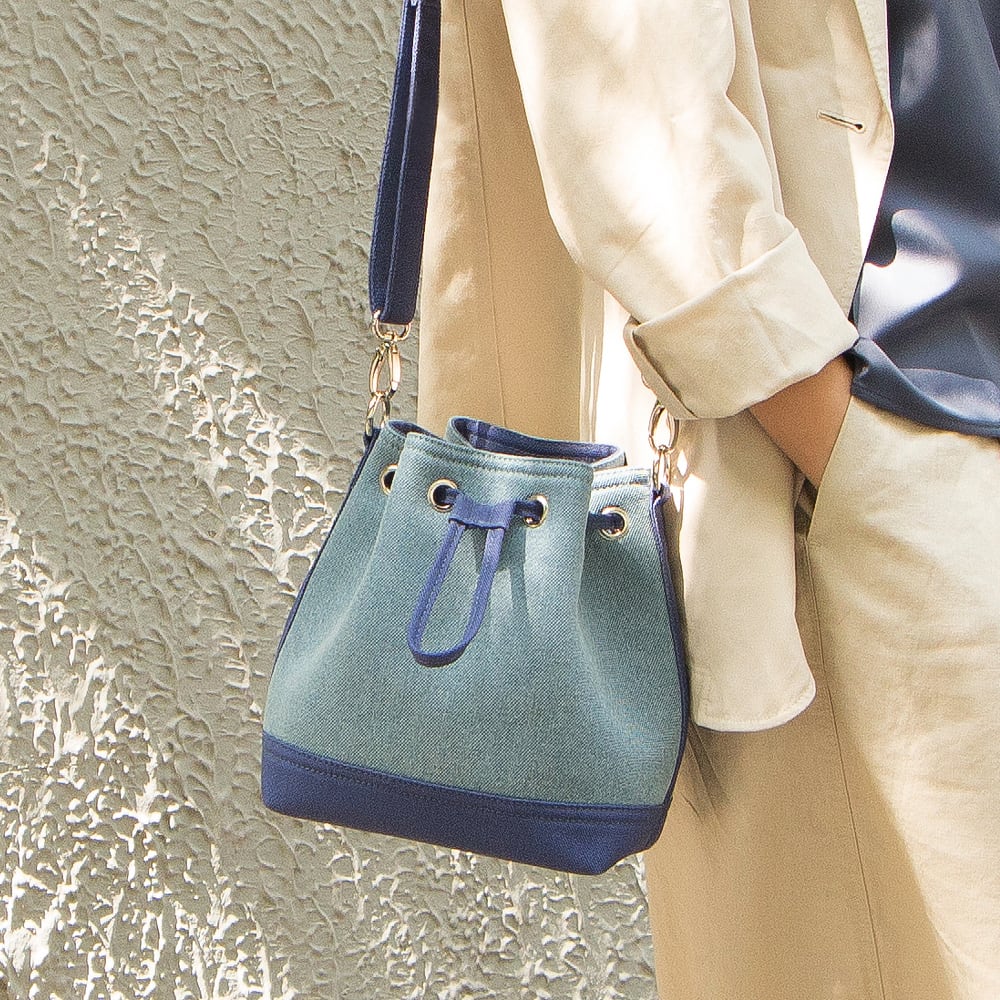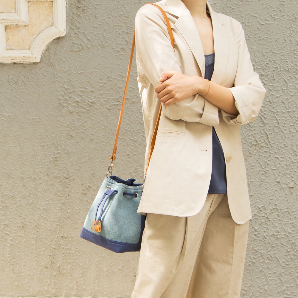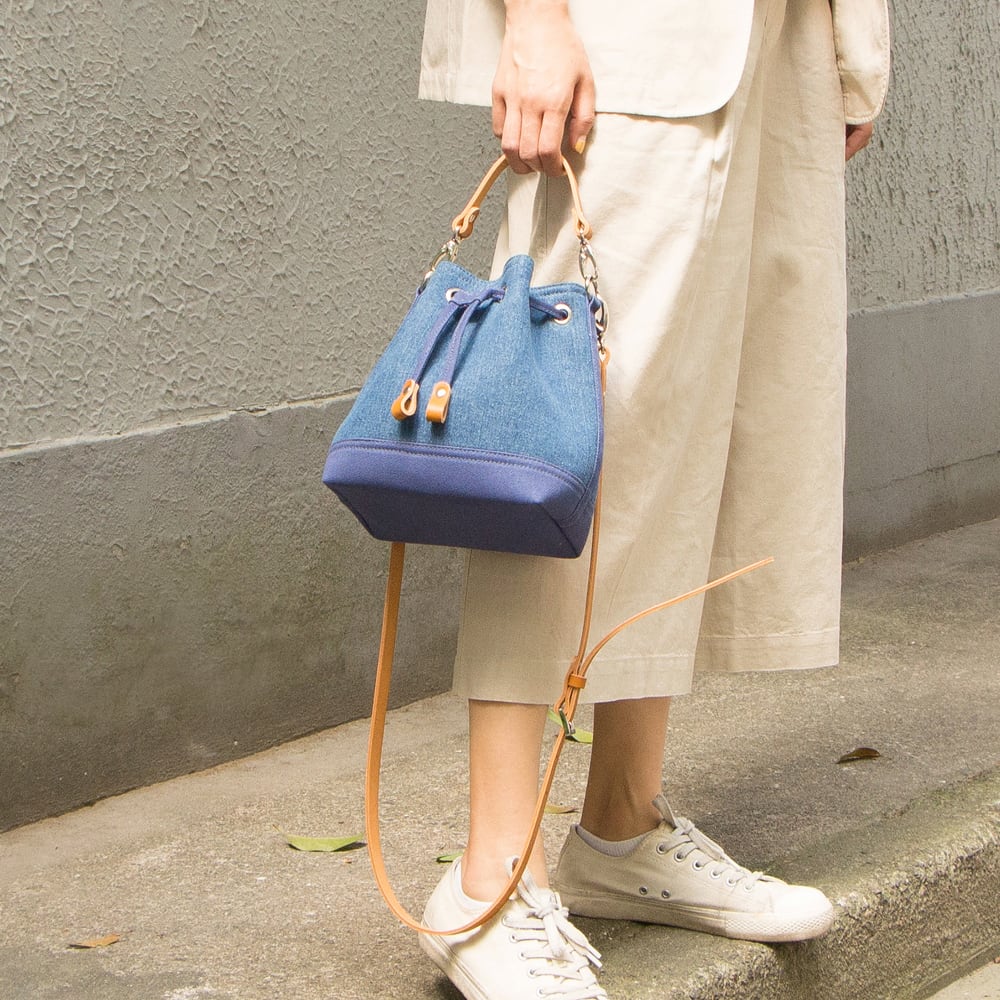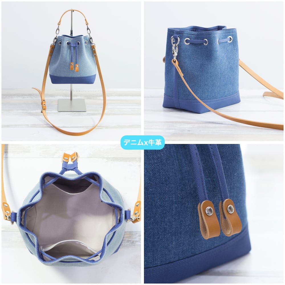 大人気の巾着型ミニショルダーバッグをデニムx帆布x牛革のフレッシュな組み合わせで製作しました。