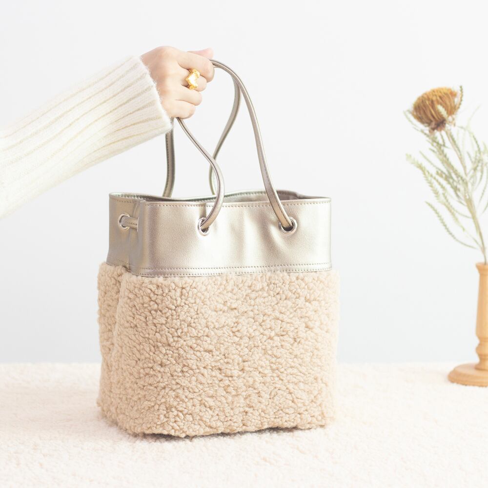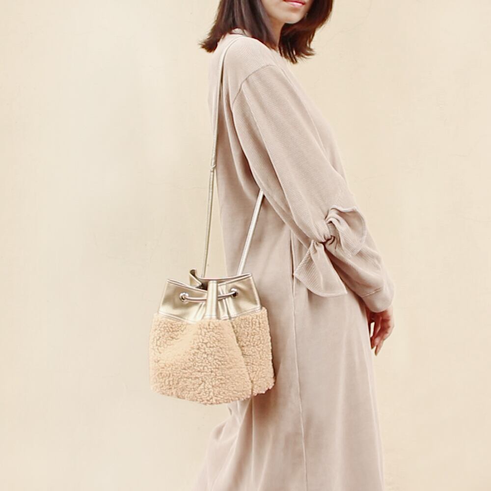 秋冬エディション変幻自在な巾着型マルチバッグ【ライトゴールドPUレザーxベージュボア】Multiway Fluffy Drawstring Bucket Bag【Beige Eco-fur x Light Gold PU Leather】